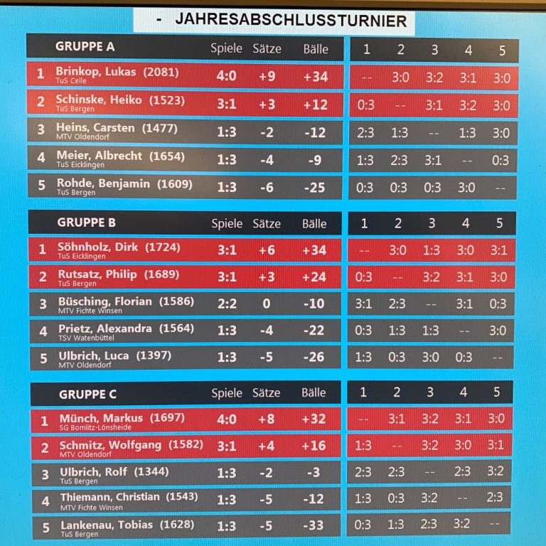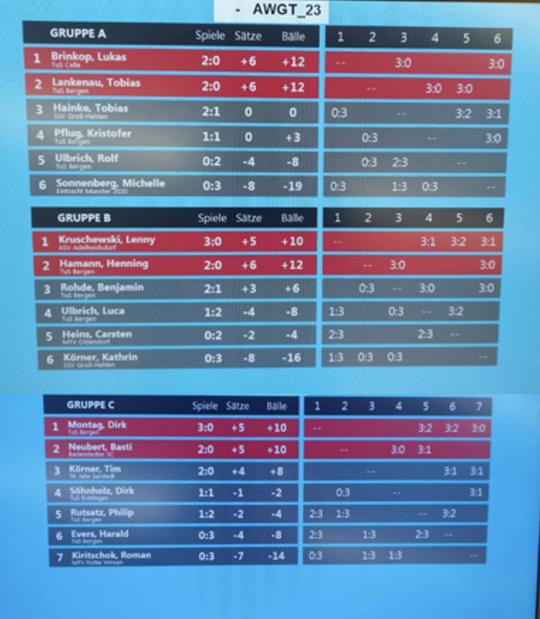 „Das Maß aller Dinge war der Favorit Dominik Blazek (VfL Westercelle), der sich ohne Satzverlust den Titel sicherte. Dahinter landete ohne weitere Probleme Jonathan Hantzko (TuS Lachendorf). Platz 3 ging an Luca Ulbrich (TuS Bergen), der vor Louis Seng (TSV Wietze) einlief.“ Aus dem Bericht von Lukas Brinkop