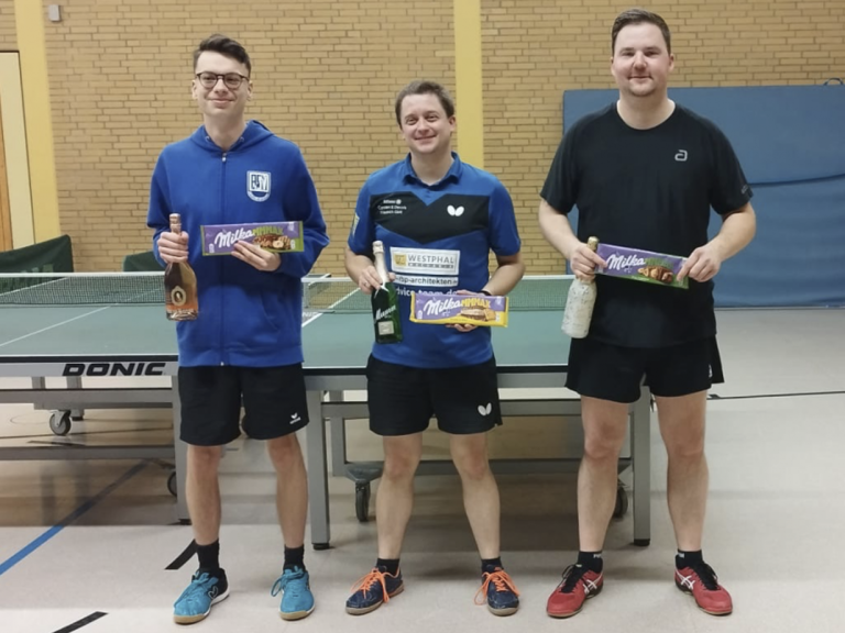 Am Samstag spielten die Herren B (bis QTTR-Wert 1500). Dort starteten Detlef Knoop und Marc Schäfer. Hier konnte Detlef sich bis auf den 3. Platz vorspielen. Er musste Christian Thiemann vom MTV Fichte Winsen und Henrik Holland vom TTC Fanfarenzug Celle-Garßen vor sich lassen. Mit Detlef zusammen auf den 3. Platz kam der 11-jährige Ben Ziesler vom VfL Westercelle.